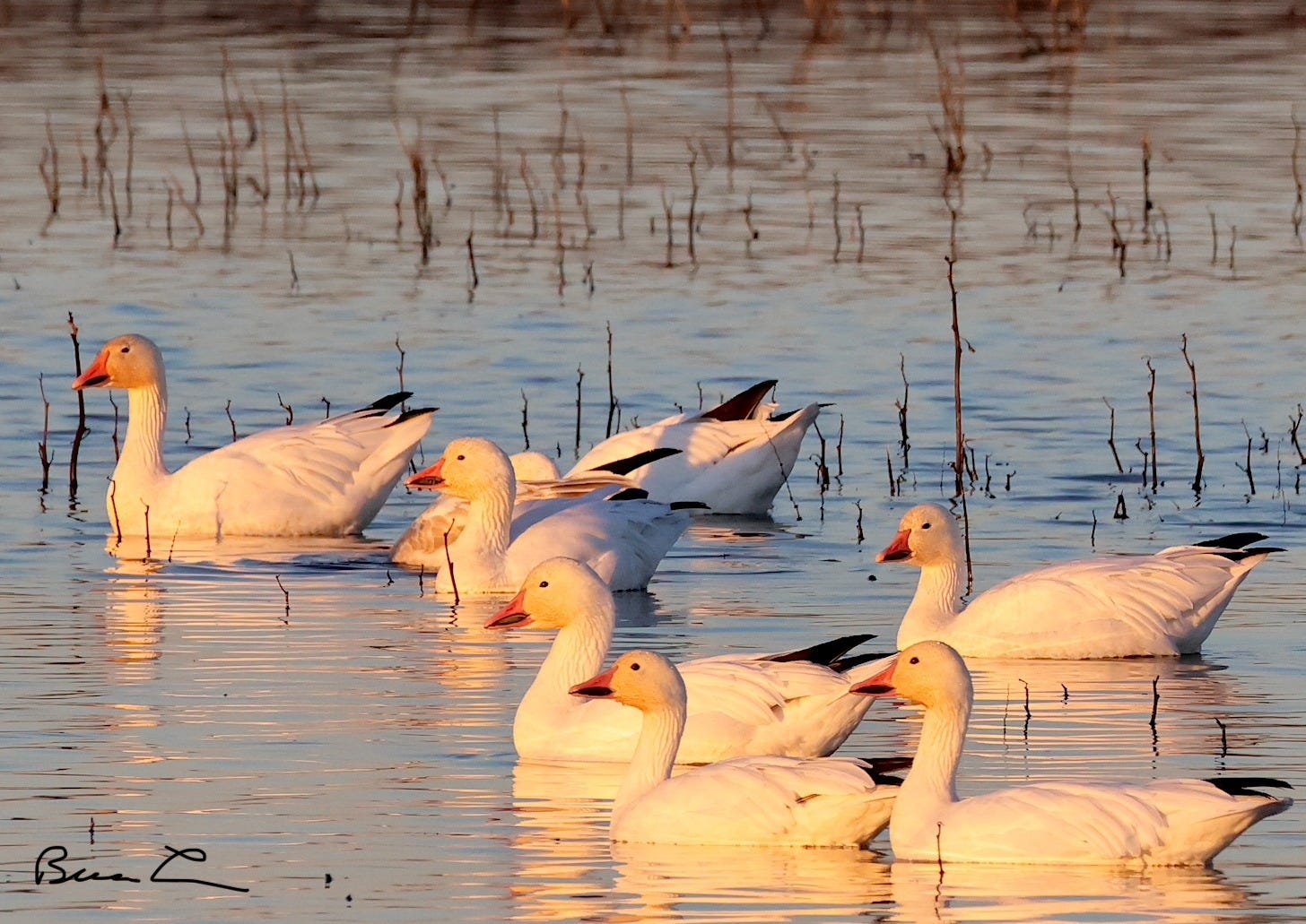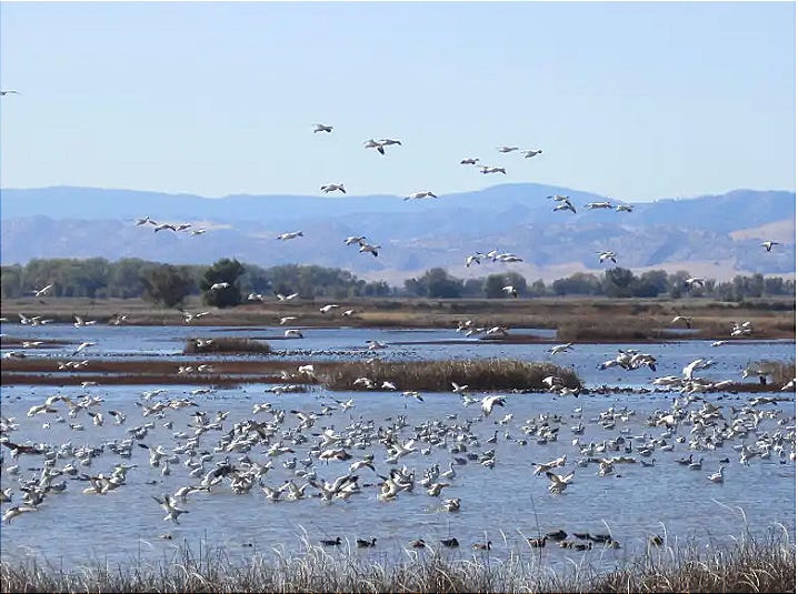 These very snow geese came to California to muck about in shallow waters and marsh bottoms for any plant matter they can get their bills on. (The rust on their heads is staining from iron-oxides pervading the silt and mud).2